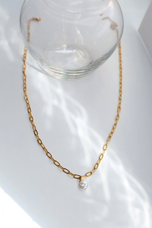 Nerezový zlatý náhrdelník s perlou a zapínáním WAKA