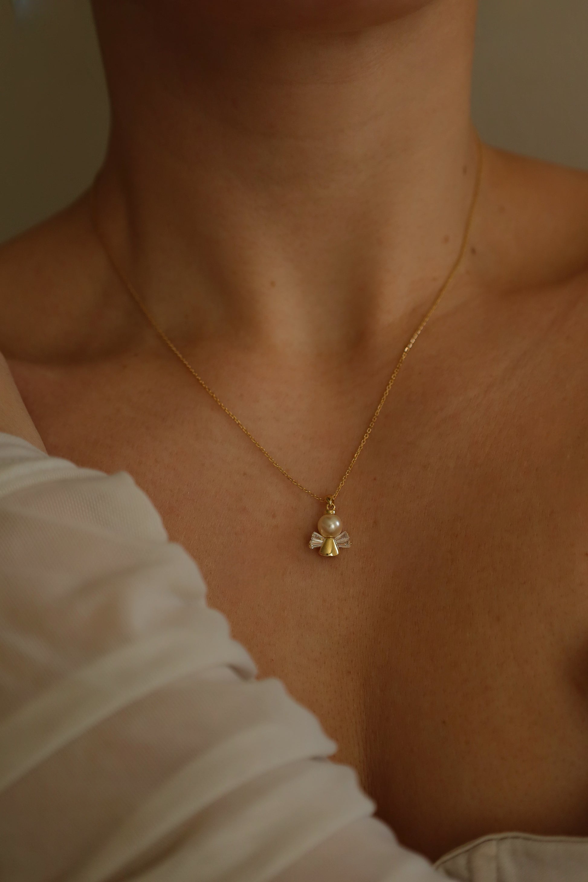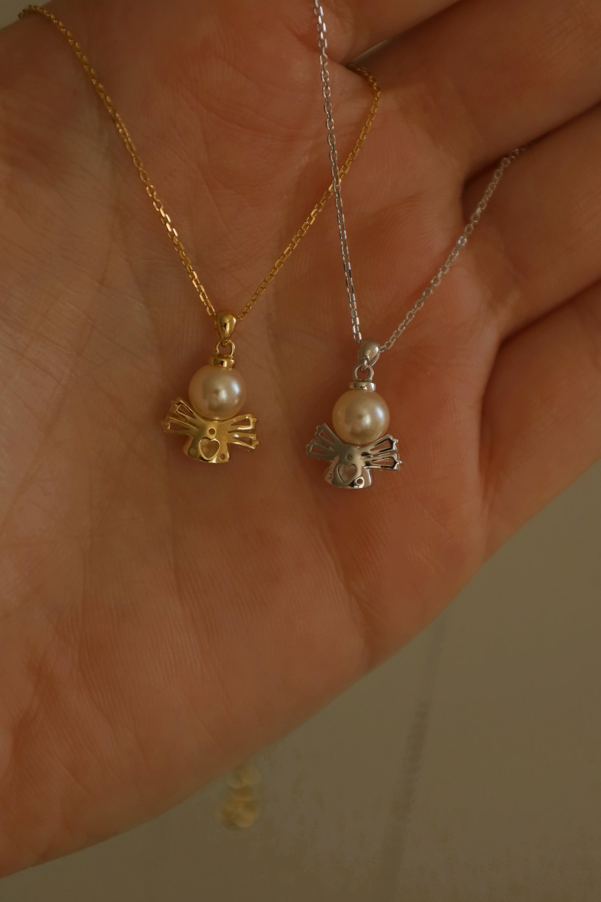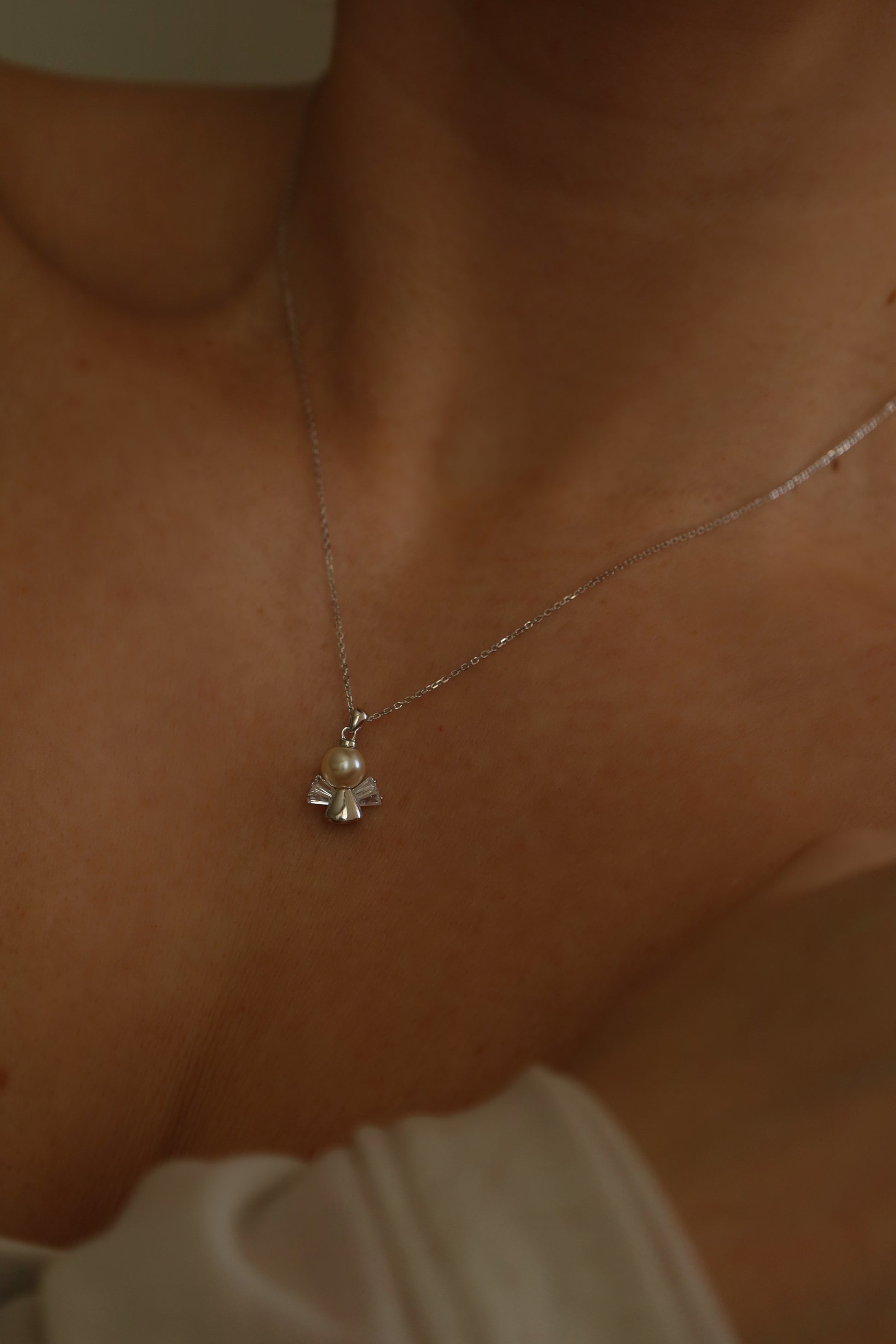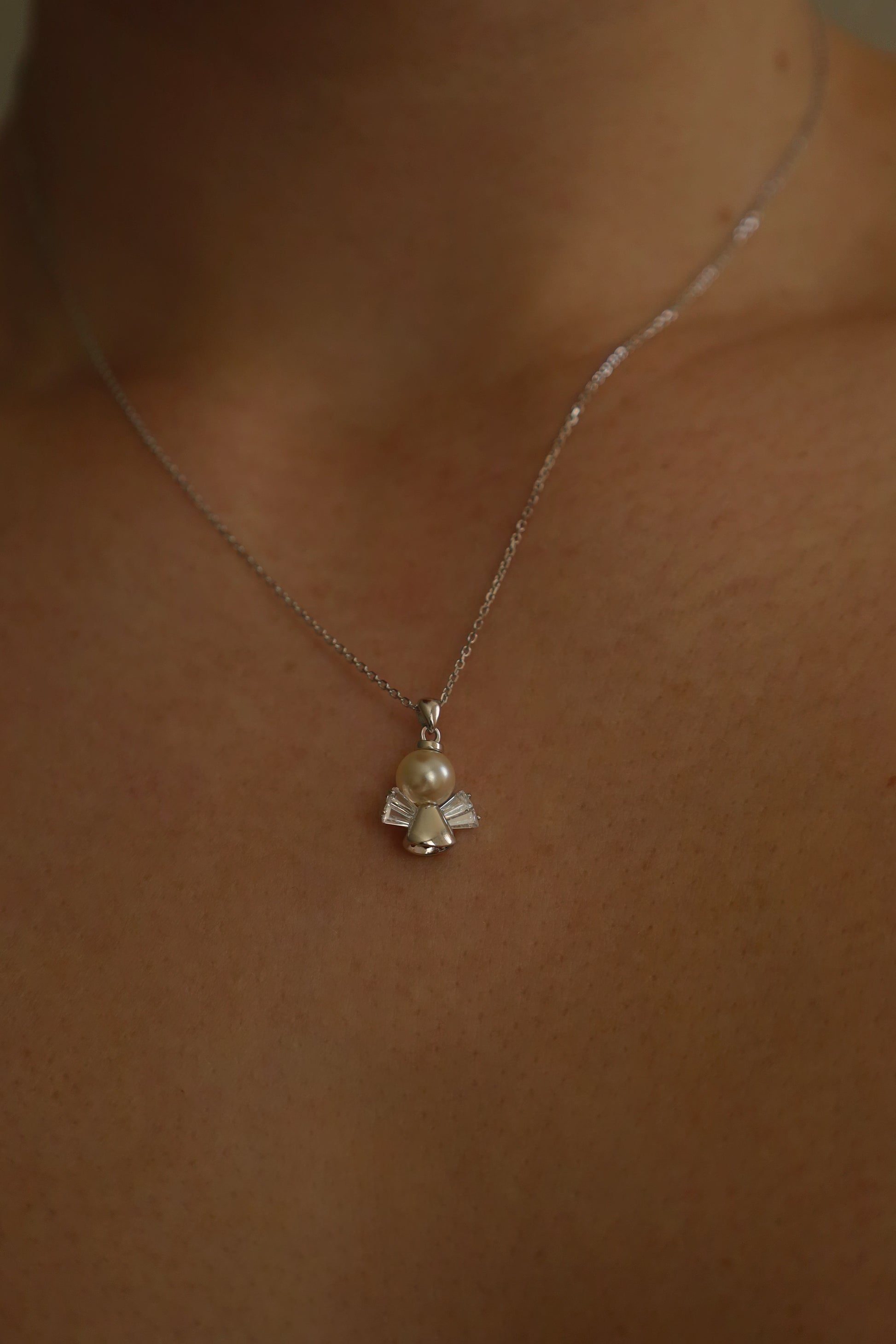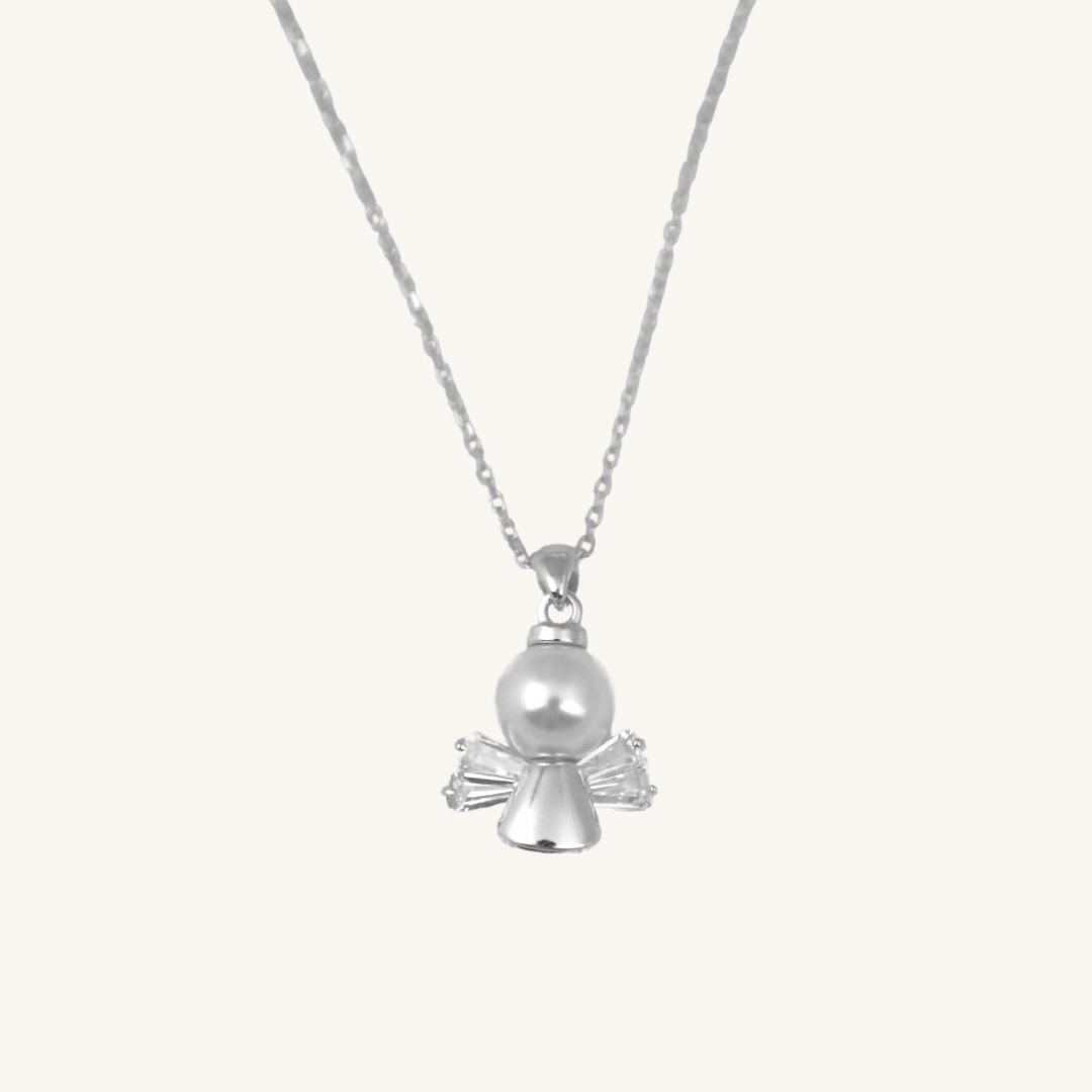 V srdci přívěsku se nachází perlička – nadčasový prvek elegance a čistoty. Tento detail podtrhuje něžnost a harmonii celého šperku. Náhrdelník je ideálním talismanem pro každodenní nošení, připomínající, že nikdy nejsme sami a vždy nad námi bdí něco vyššího.